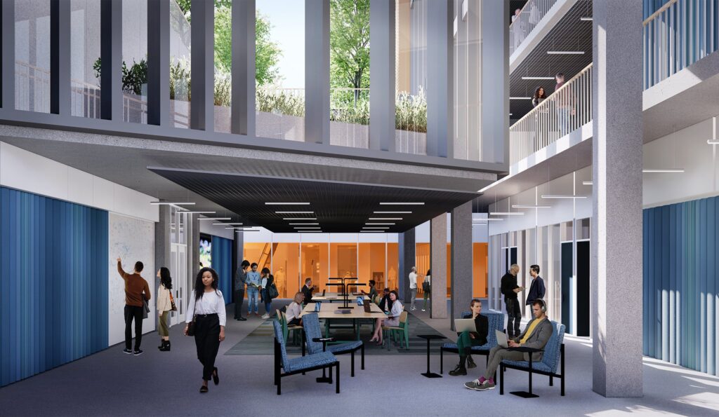 The overall project includes a host of specialized design features that promote advanced scientific research and sustainability, including the drilling of more than 250 geothermal wells that will, along with a new Thermal Utilities Plant, help heat and cool buildings as part of the university’s plan to achieve zero-carbon status on campus by 2050.