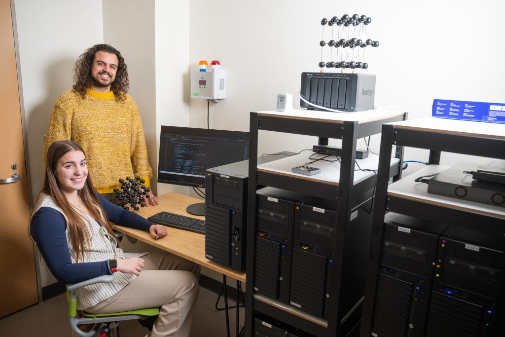 Physics majors Maggie Blanchard and Andre Correa working at the high-performance computing cluster in the QNT