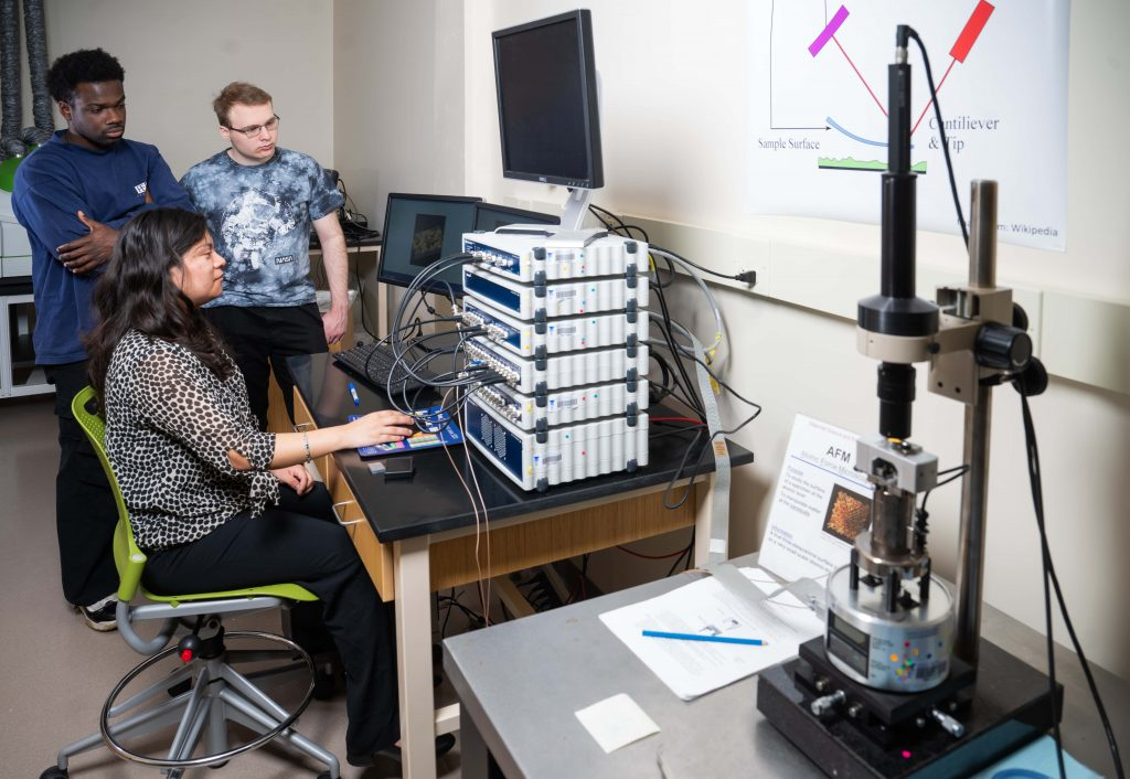 Undergraduate students Crossby Dessalines (computer science), Maritza Sanchez (chemistry), and Julian Rus (physics) working at the atomic force microscope in the QNT
